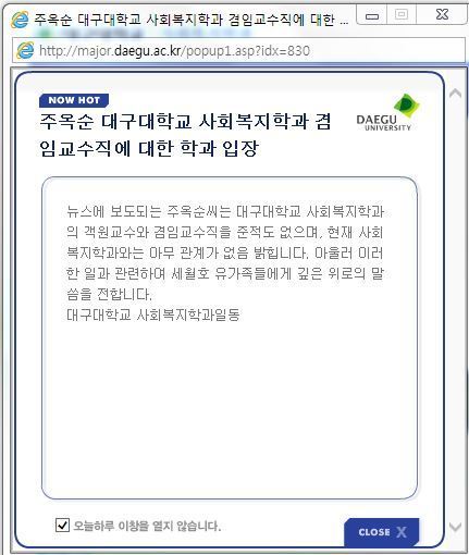 대한민국 '엄마'를 사칭한 채 세월호 사고 유족들에게 막말을 퍼부어 국민들의 공분을 산 '대한민국 엄마부대 봉사단' 주옥순 대표(수구 꼴통들 때문에 '엄마'를 잃다 참고)가 또 다른 논란에 휩싸였다. 이번에는 교수직 사칭 논란이다. 엄마 사칭자 주옥순씨가 대구대학교 사회복지학과 교수로 알려지자 몇몇 누리군들은 대구대학교 사회복지학과에 항의했고 이 과정에서 엉뚱하게 주옥순씨가 교수가 아님이 드러난 것이다. 대구대학교 사회학과 홈페이지에 들어가면 이와 관련하여 팝업이 뜬다.