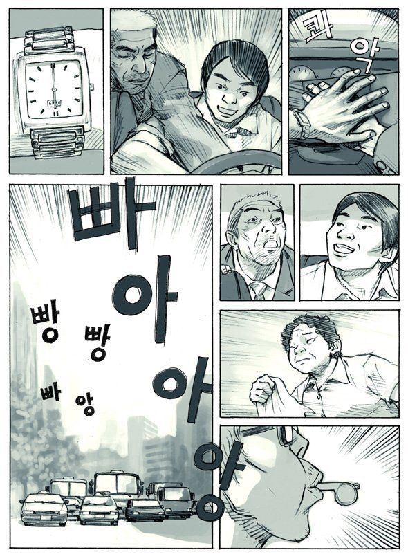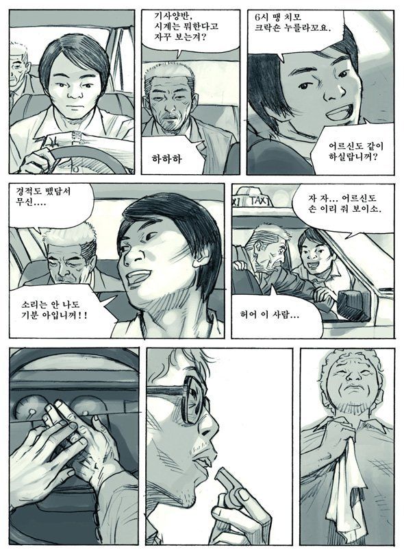두번째로 마음에 와 닿은 장면은 영호의 아버지가 택시 안에서 경적시위에 함께 하는 것이다. 택시 기사는 회사에서 경적 시위에 참여할까봐 경적을 다 떼버렸다고 말한다. 경적도 없는 택시로 경적 시위에 참여한다는 택시기사의 권유로 영호의 아버지도 경적을 누르는데 함께 한다. 경적을 떼버렸다는 택시기사의 말과는 달리 영호의 아버지가 경적을 누를 때 큰 경적 소리가 울려퍼진다. 그게 그 택시에서 난 소리든 다른 차들의 소리든 상관없다. 경적을 떼어버린 자동차는 자신의 목소리를 잃은 국민과 다르지 않다. 나 같은 것 한명이 내는 소리가 무슨 울림이 있겠느냐고 묻는 그런 한사람 한사람이 마치 이 택시와 다를바 없다. 목소리가 나오지 않더라도, 목소리가 작아서 남에게 들리지 않더라도 그런 사람들이 함께할 때 만화에서 처럼 큰 울림이 있을것이라 믿는다.