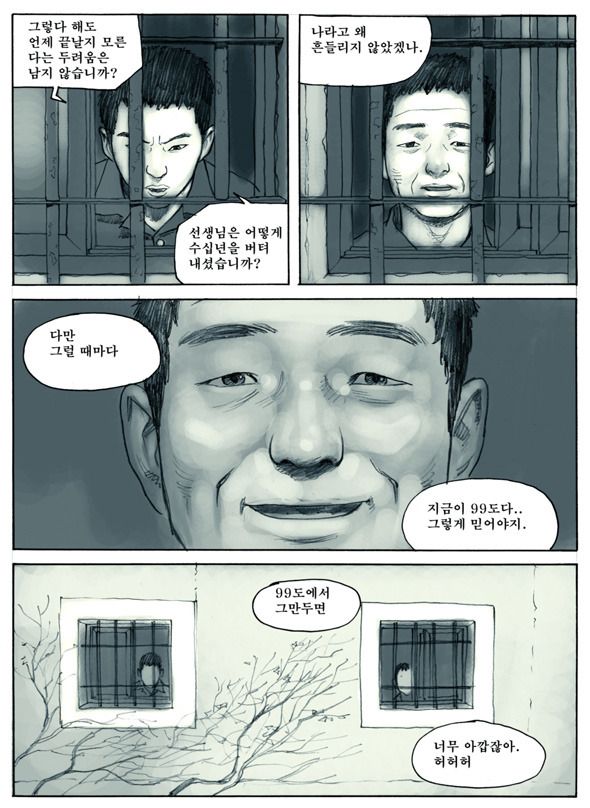 이 만화의 중심 주제이자 가장 감명깊은 장면은 영호가 감옥에서 선생님(누군지는 모르겠다)과 대화 하는 장면이다. 영호는 세상을 바꾸려는 이 싸움에 이길 수 있을 지, 끝은 있기는 할지 고민한다. 이때 선생님은 "물은 100도씨가 되면 끓는다네... 하지만 사람의 온도는 잴 수가 없어... 하지만 사람도 100도씨가 되면 분명히 끓어. 그것은 역사가 증명하고 있어"라고 말한다. 이에 영호가 "그렇다 해도 언제 끝날지 모른다는 두려움은 남지 않습니까?"라고 묻자, 선생님은 "지금이 99도다... 그렇게 믿어야지" 라고 대답한다.
