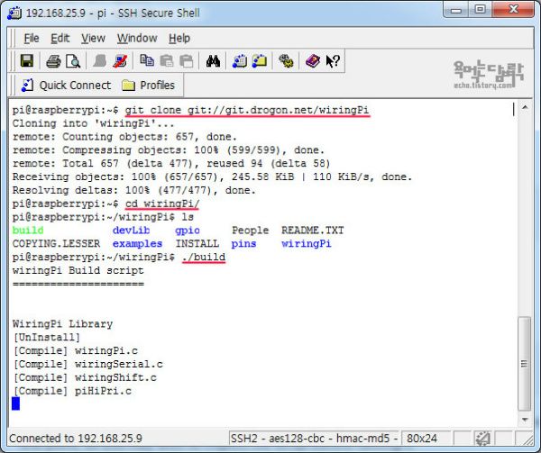 GPIO를 컨트롤 하는 가장 쉽고 편한 방법은 WiringPi 라이브러리를 사용하는 것이다. Git가 설치되어 있으면 WiringPi를 설치하기가 수월하다. Git이 설치되어 있지 않다면 'sudo apt-get install git-core'를 입력해서 설치한다. Git이 설치되어 있으면 'git clone git://git.drogon.net/wiringPi'를 입력해서 WiringPi를 다운 받는다. 다운 받은 디렉터리에 들어가서 './build'를 입력하면 설치 끝.