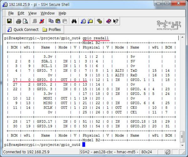 제대로 설치되었는지 확인하기 위해서는 'gpio readall'을 입력한다. 아래 사진과 같은 화면이 나온다. 제일 왼쪽행(BCM)은 Broadcom의 BCM2835 칩에서 사용하는 핀번호, wPi는 WiringPi 라이브러리의 핀번호, Name은 GPIO의 이름, Mode는 핀이 입력모드인지 출력모드인지를 알려주고, V는 핀의 값으로 1은 전압이 High상태 0은 Low상태, 그리고 Physical은 라즈베리파이 핀헤더의 번호이다. 예를들어 밑줄 친 열을 보면 11번 헤더핀이 출력모드이고 값은 0인 것을 알 수 있다. 유튜브(http://www.youtube.com/watch?v=Wr49ia3oID4)에 올라온 실험에 따르면, 핀이 입력모드일 때 전압이 0-1.19v는 0, 1.34-3.3v는 1으로 인식된다고 한다.