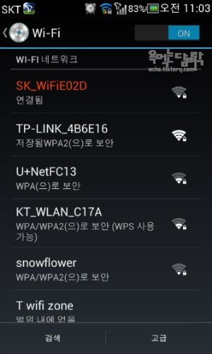 이제 거실에서도 방에서도 와이파이가 잘 터진다. 아래 위에 보이는 두개의 와이파이가 방과 거실의 와이파이이다. 그런데 이렇게 사용해도 불편한 점이 있었다. 아래 그림을 보자. TP-LINK가 SK_WiFi보다 신호세기가 훨씬 강함에도 불구하고 SK-WiFi에 계속 연결되어 있다. 방을 옮기면 새로 와이파이에 접속해야하는 불편함이 생기는 것이다. 이번 포스트에서는 이를 해결할 수 있는 방법인 와이파이 로밍에 대해 알아보자.