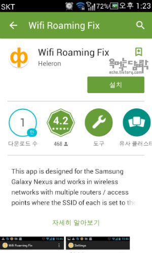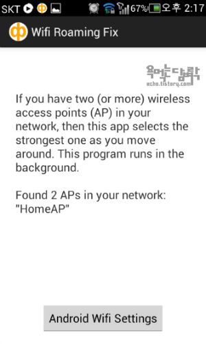 노트북보다 와이파이를 더 많이 쓰는 스마트 폰의 경우는 어떨까? 안드로이드 폰의 경우 Wifi Roaming Fix라는 앱이 있다. 이 앱은 설치해서 실행 시키기만 하면 아무런 설정을 할 필요도 없이 자기 스스로 동작한다. 앱을 실행시키지 않아도 백그라운드에서 자동으로 실행되기 때문에 따로 신경 쓸 필요도 없다.