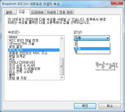 우선 윈도우 노트북의 경우 아래와 같이 해결 할 수 있다. 우선 무선 네트워크 연결 속성에 들어가서 구성 버튼을 클릭한다. 네트워크 어댑터 속성 이라는 창이 뜨면 로밍 설정 이라는 속성의 값을 강, 약, 중으로 선택할 수 있다. 강은 로밍의 횟수가 늘어나는, 즉, 접속을 끊고 다시 접속하는 경우가 늘어나고, 약은 왠만큼 신호가 약해지더라도 원래 접속해있는 커넥션을 끊지 않는 다고 생각하면 된다. 참고로 이 부분은 무선 네트워크 카드의 제조사에 따라 조금씩 다를 수 있다.