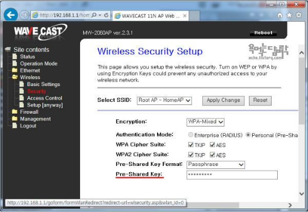 우선 WaveCast 공유기를 설정해 보자. 알아낸 공유기 주소를 웹브라우저에 입력해서 로그인을 한다. Wireless->Basic Settings에 들어가서 SSID 값을, Wireless->Security에 들어가서 비밀번호를 변경한다.