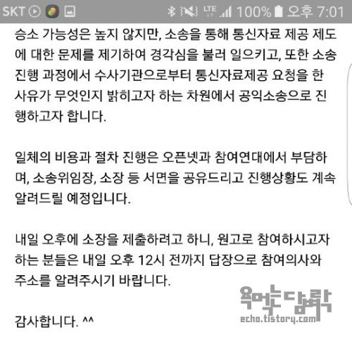 어제는 오픈넷을 통해 한겨레 기자에게 전화가 왔다. 오늘은 오픈넷에서 통신자료 제공과 관련된 공익소송을 진행한다고 해서 참여하기로 했다. 승소할 가능성은 낮다고 하지만. 끝까지 물어주마.