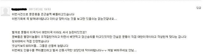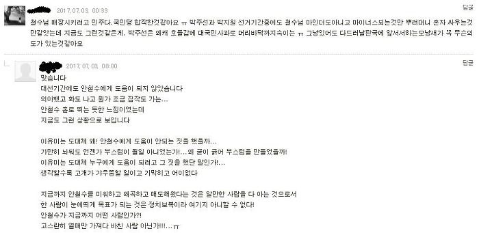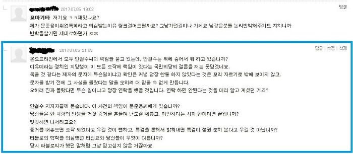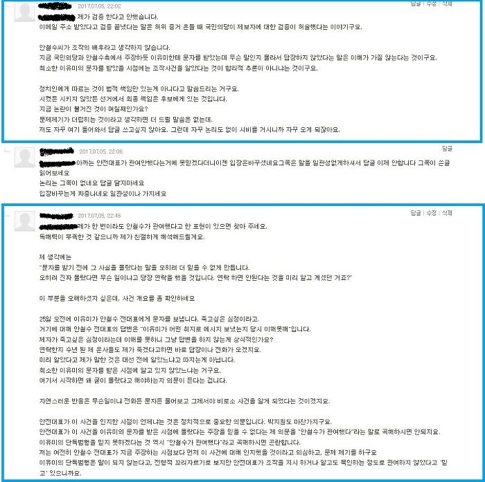 문준용씨는 이 사건의 피해자 아닌가? 안철수는 범죄의 수혜자였고. 문준용이 조사 받으라는데, 조사 받는다면 결과는 믿을거야? 원하는 결과가 나오지 않으면 검찰, 정권 욕 하면서 안 믿을 거면서. 대한미국은 그냥 해프닝 아닌가? 대통령이 저런 실수도 공개 사과해야해? 국민의당이 민주당이랑 손 잡고 안철수 죽이기에 나선다는 대뇌망상은 참. 이유미는 안철수에게 도움 안되는 일(?)을 했다는데, 민주당이 기획을 했고 이유미가 프락치라는 거야? 그런데 왜 아무도 지적하지 않지? 이상한 일이네. 하고 댓글을 남겼다. 조금 거칠었는지도 모르겠다. 밤꽃냄새가 너무 진해서 조금 흥분, 아니 짜증이 났다. 그런데 내 댓글에 누가 댓글을 달았다는 알림을 보고 다시 들러봤는데.