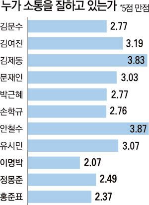 2011년 우리 국민이 뽑은 소통의 달인은 누구였을까? 2011년 12월 1일 MBN의 개국 설문조사에 따르면 안철수였다. ('소통의 달인' 안철수…유명인 11명중 1위) 5점 만점에 3.87점. 문재인 현 대통령보다도, 유시민 작가보다도 0.8점 이상 높은 수치다. 이명박 가카와 비교하면 거의 더블 스코어. 그도 그럴 것이 2011년은 정치인 안철수가 탄생한 배경이 된 소위 '안풍'이 전국을 강타했던 해였다. 전국을 돌며 청년들과 공감하고 소통하는 청춘 콘서트를 통해 그는 '소통의 아이콘', '청춘의 멘토'로 급부상 했었던 해였다.