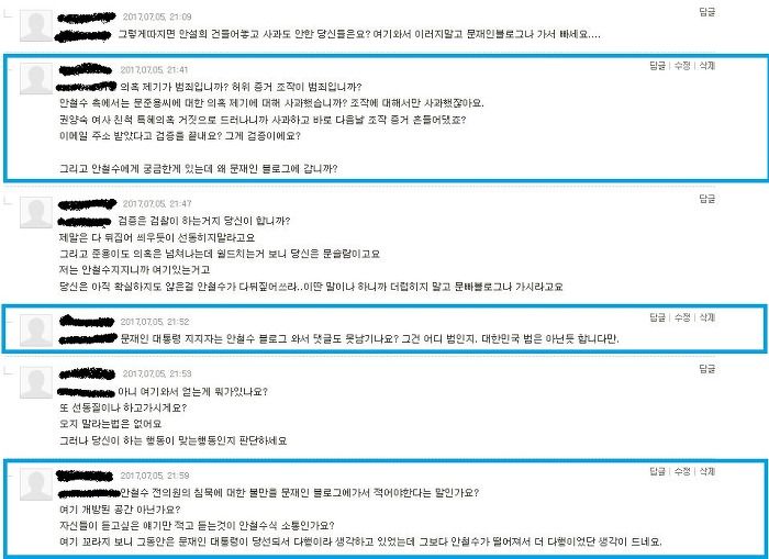 재미있어서 댓글 단 거 아닌데, 허위 사실이 마치 사실인양 퍼지는게 싫었고, 걱정돼서 댓글 몇 개 썼는데. 솔직히 내가 10선비 기질이 다분해서, 지적질 하는걸 좋아해서 그런 것일 수도 있지. 그런데 댓글을 다 지울 일은 아니지 않나? 개인 블로그면 그럴 수 있지. 그런데 정치인 공식 블로그잖아. 팬페이지나 팬카페에 들어가서 그랬다면 매너가 아닐 수 있는데, 블로그 잖아. 팬이 아닌 사람들도 드나들 수 있는. 안철수는 연예인도 아니고, 정치인인데. 사안에 대해서 입장을 묻는 내가 잘못된 것인가? 그리고 소통의 달인이라면서, 이게 소통이야?
