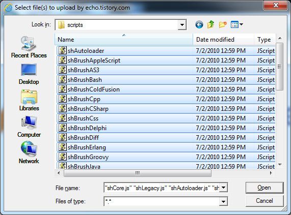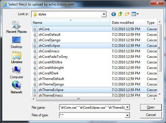 SyntaxHighlighter 홈페이지에 들어가서 다운받는다. 압축된 파일을 받게 되는데 받아서 scripts 디렉토리 안에 있는 모든 파일과 styles 디렉토리 안에 있는 shCore.css, shCoreXXX, shThemeXXX를 티스토리에 올린다. 여기서 XXX는 스킨 이름으로 Eclipse, Emacs, Midnight 등이 있다.