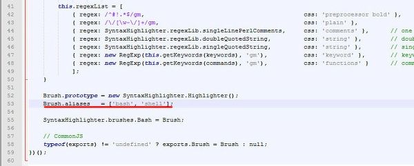 SyntaxHighlighter는 c++, c#, css, java, Php등 다양한 언어를 지원한다. 사용할때 언어를 지정하기 위해 브러시 이름을 알아야 하는데, 이는 shBrushXXX.js 파일을 열어보면 알 수 있다. 다음은 shBrushBash의 일부분인데 bash와 shell이 브러시 이름인 것을 알 수 있다.