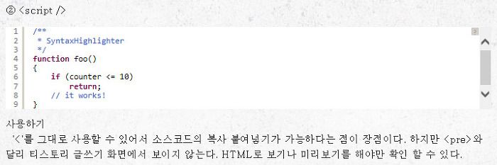 '<'를 그대로 사용할 수 있어서 소스코드의 복사 붙여넣기가 가능하다는 점이 장점이다. 하지만 <pre>와 달리 티스토리 글쓰기 화면에서 보이지 않는다. HTML로 보기나 미리보기를 해야만 확인 할 수 있다. 어디에 표시되는지 글쓰기 화면에서 확인할 수 없기 때문에 아래와 같이 황당하게 편집 될수도 있다는 단점이 있다. 또 다른 단점은 코드안에 </script>가 있을 경우, 많은 웹 브라우저가 제대로 표현을 못한다. 그리고 대부분의 rss리더가 <script>부분을 읽지 않기 때문에 블로그에 올리는데는 <pre>가 더 적합 할 수도 있다.