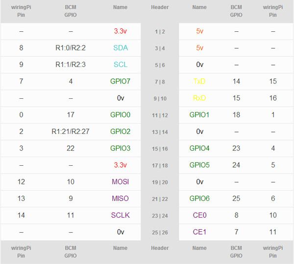 아래 두 테이블은 라즈베리파이 모델B Rev2의 GPIO 핀번호를 나타낸 것이다.